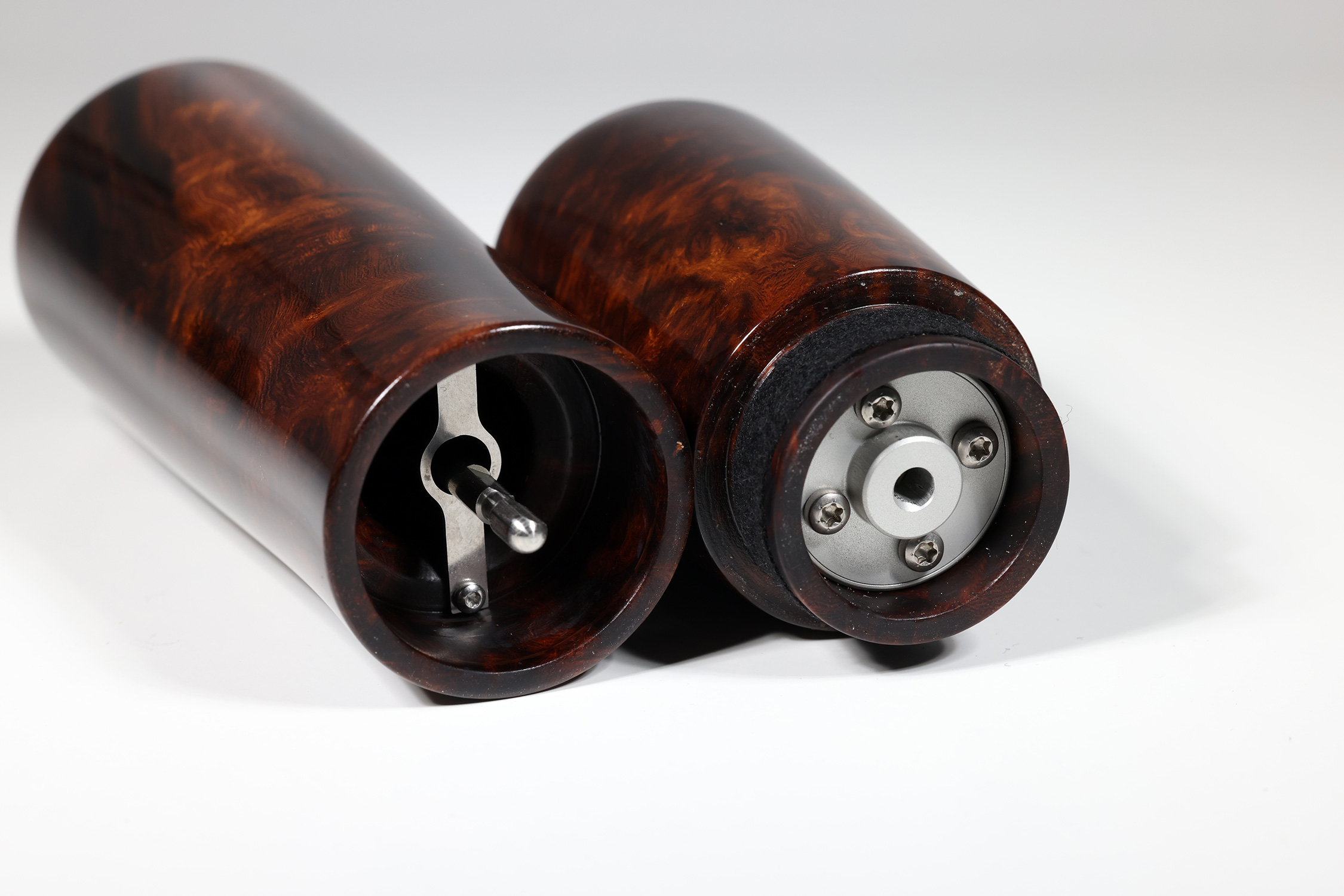 Was macht ein gutes Mahlwerk aus? Es gibt von etlichen Herstellern, von industrieller Großproduktion wie Peugot, WMF etc. bis hin zur in Einzelproduktion hergestellten Mühle eines Hobbydrechslers (meist CrushCrind) verschiedene Mahlwerke, welche dort zum Einsatz kommen. Hier gibt es im Grunde nur zwei Varianten und jede hat ihre Vor- und Nachteile. Zum einen gibt es Mahlwerke aus Keramik, welche neben dem meist recht günstigen Preis noch den Vorteil bieten, uneingeschränkt für Salz verwendet werden zu können. Stahlmahlwerke können nicht für Salz verwendet werden, da sie korrodieren. Meist aus Kostengründen, gerade im Massenmarkt, verwenden Mühlenhersteller Keramikmahlwerke für Salz aber auch für Pfeffer. Dies ist gerade bei Pfeffer für die Aromaentwicklung sehr ungünstig. Bei Keramikmahlwerken wird der Pfeffer zerquetscht, anstatt feinst geschnitten. Dies ist aber wichtig, gerade wenn Sie beispielsweise einen edlen Kambotpfeffer verwenden.