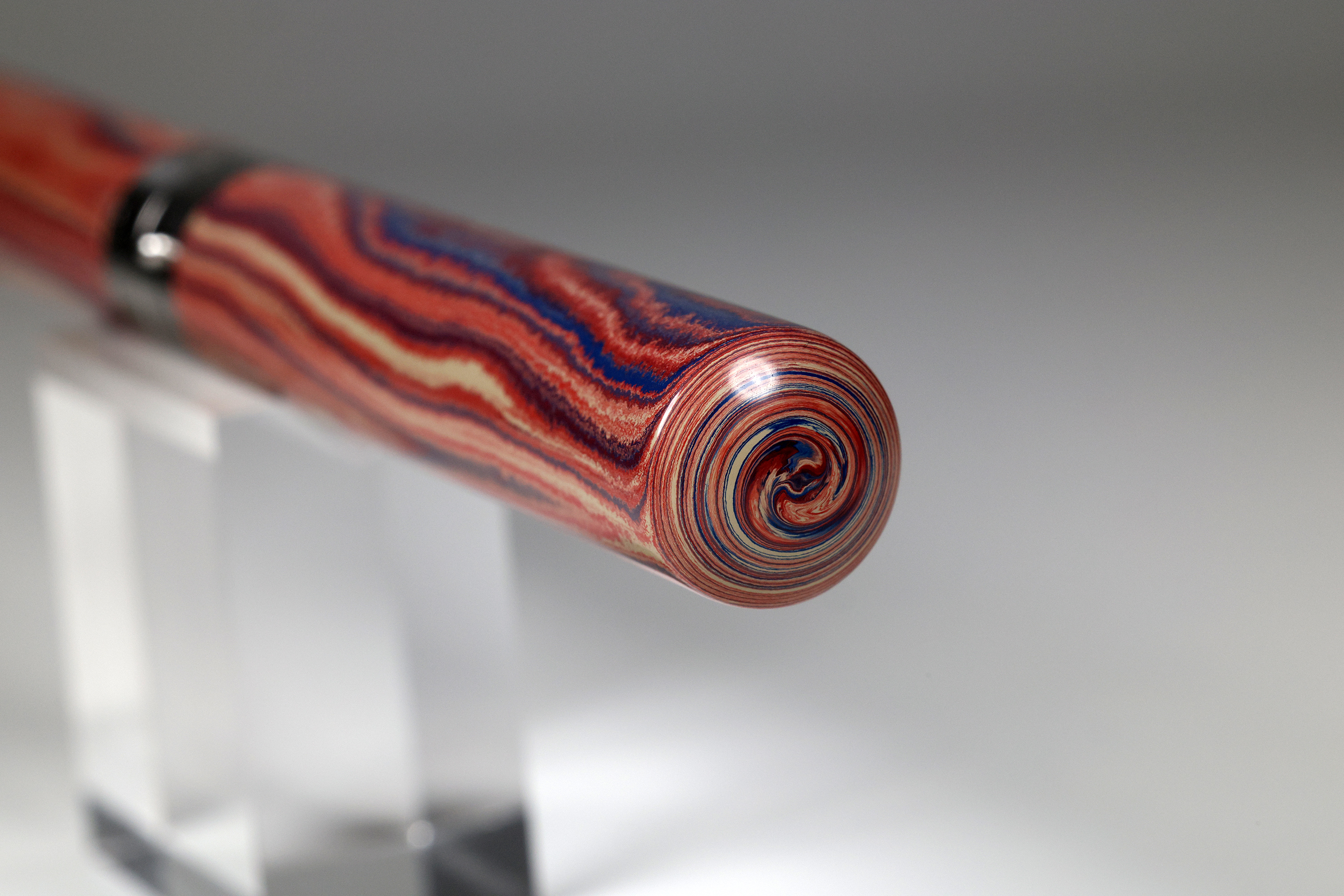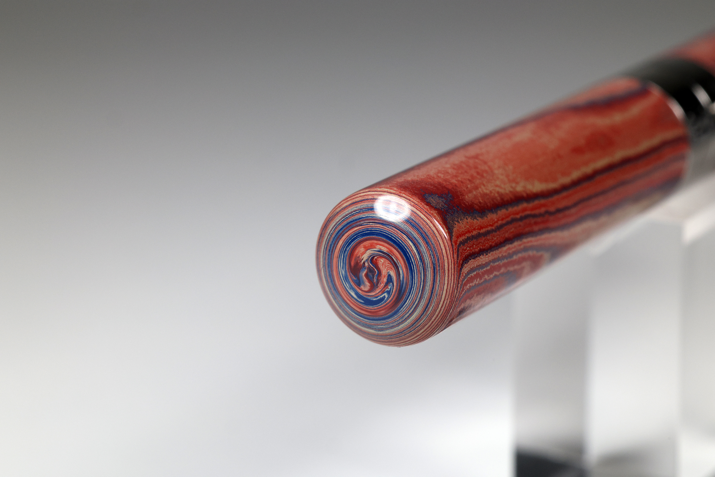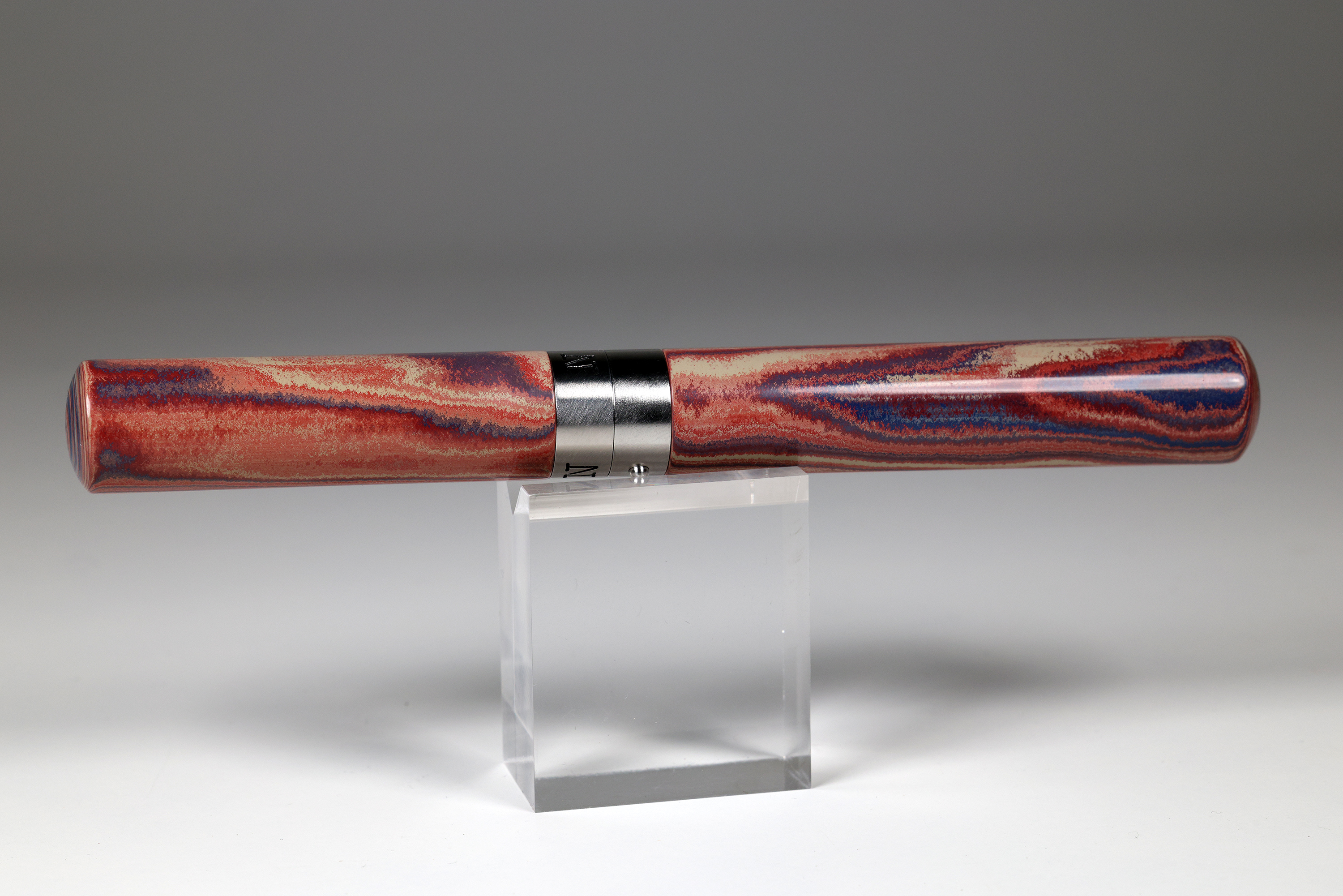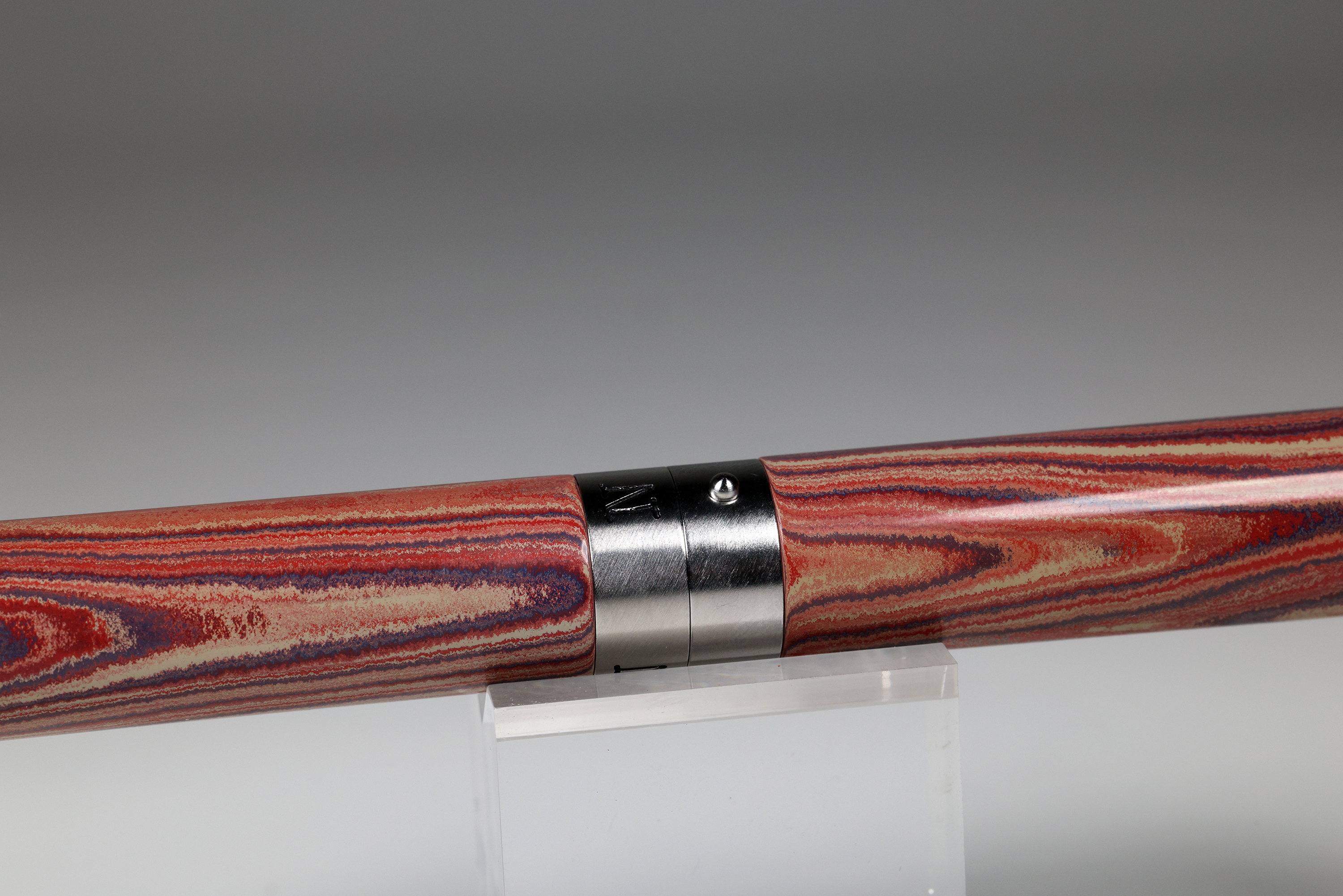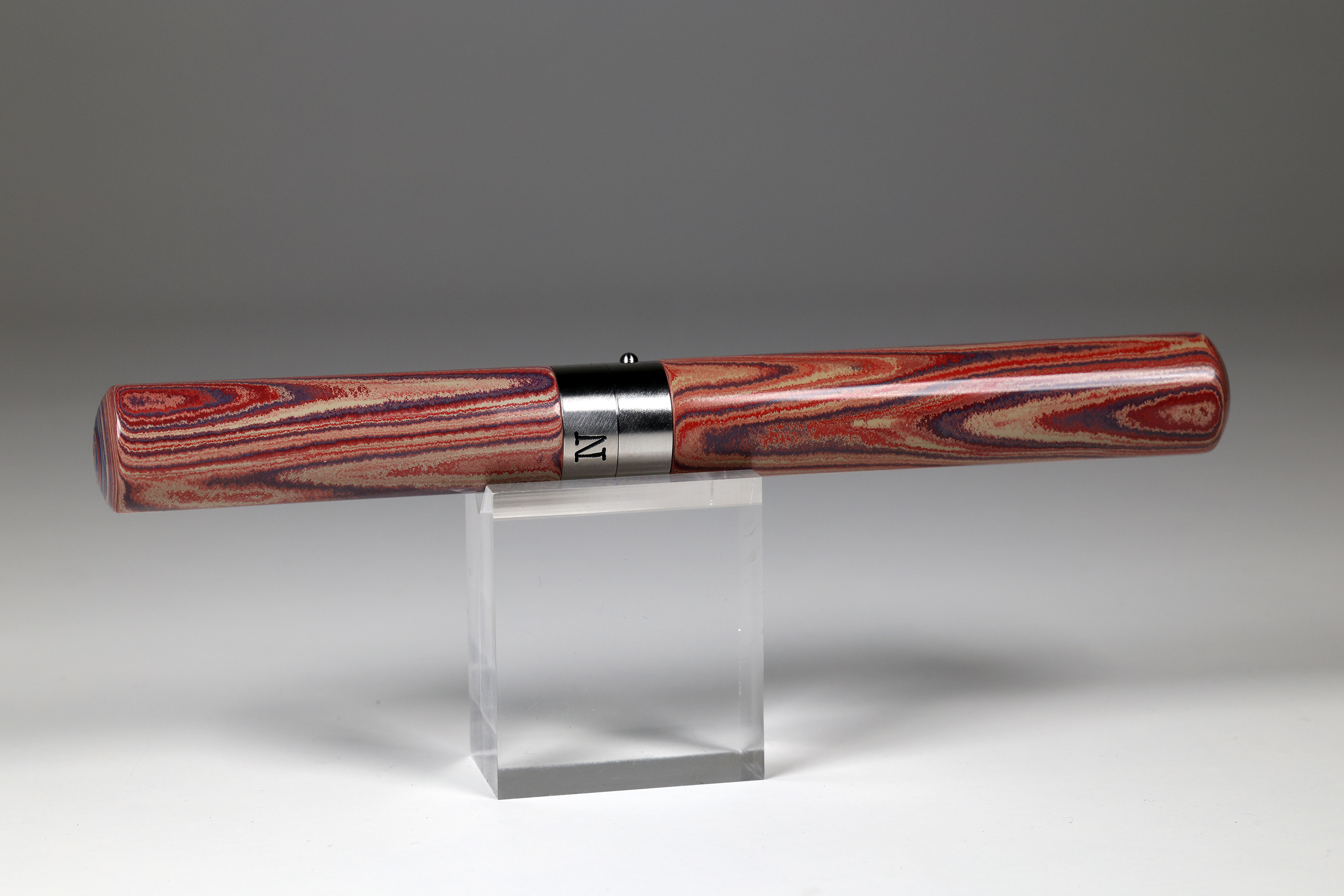 Ausgestattet ist der EXPLORER mit einem äusserst schlanken aber sehr effektivem Roll-Stop-Pin. Dieser sorgt dafür, das der EXPLORER genau da bleibt wo er hingehört. Auf Ihrem Schreibtisch. Auch im aufgeschraubten Zustand. Auf einen Clip wurde bewusst verzichtet. Gefertigt wurde der Füller als sogenannter Closed-End.
