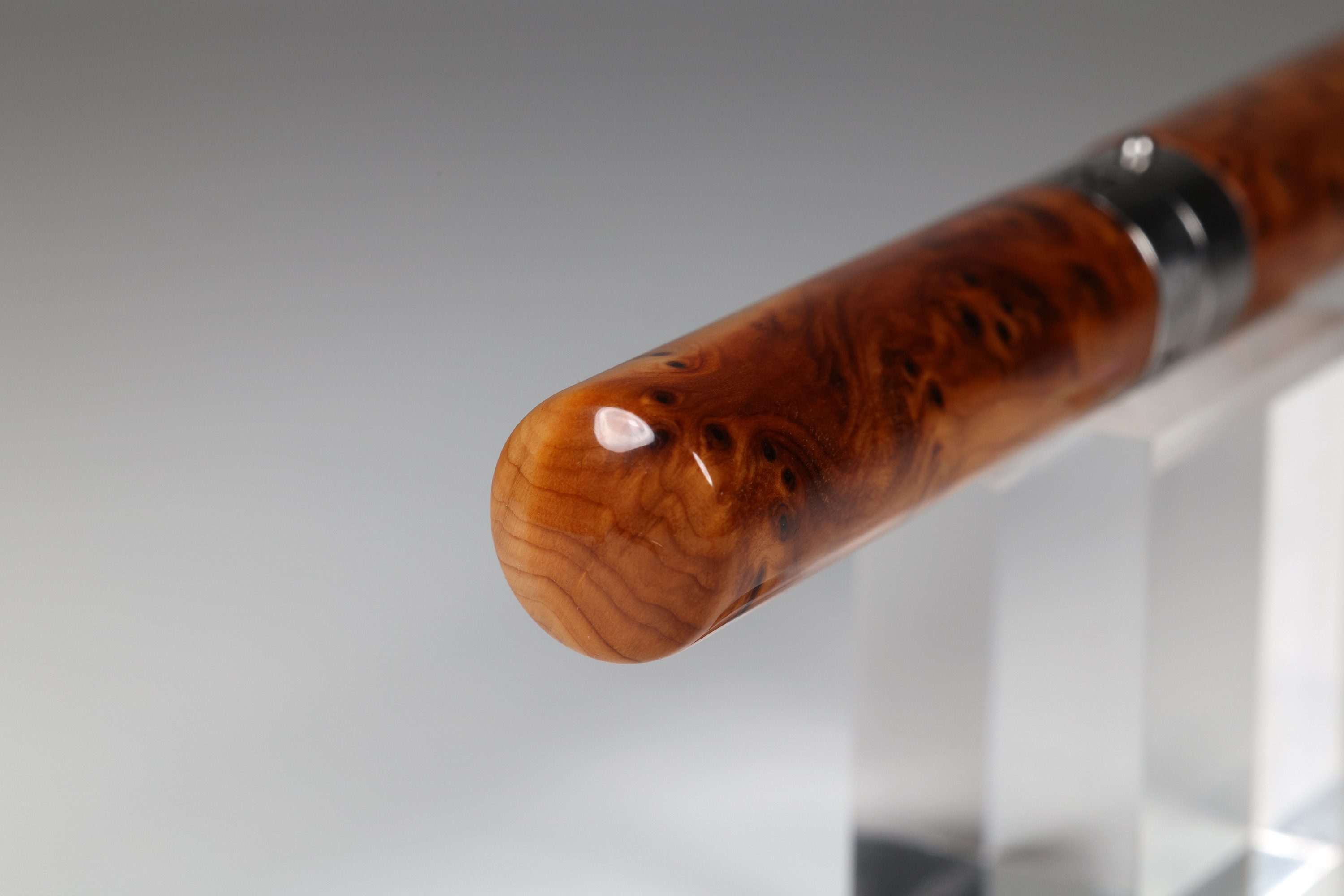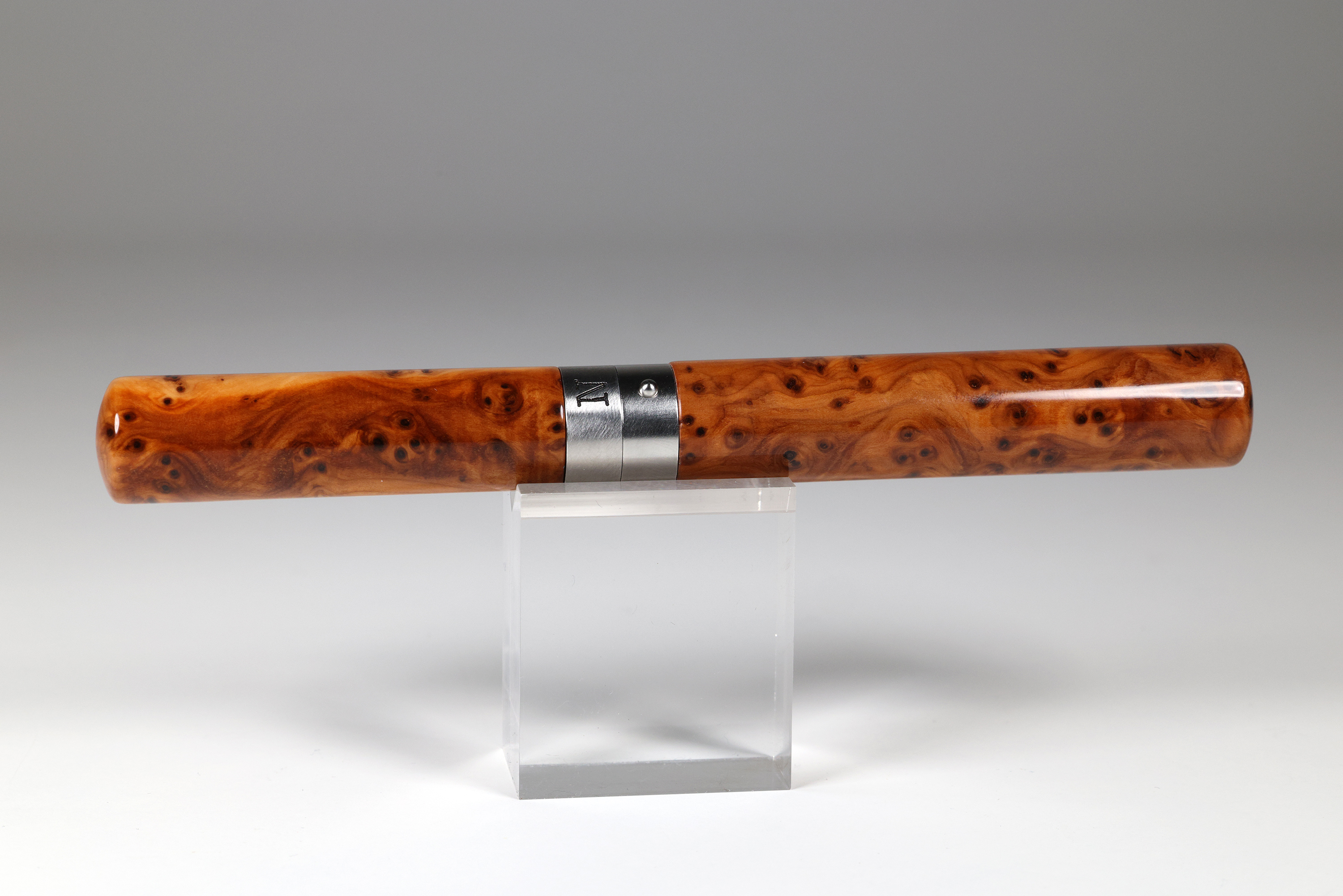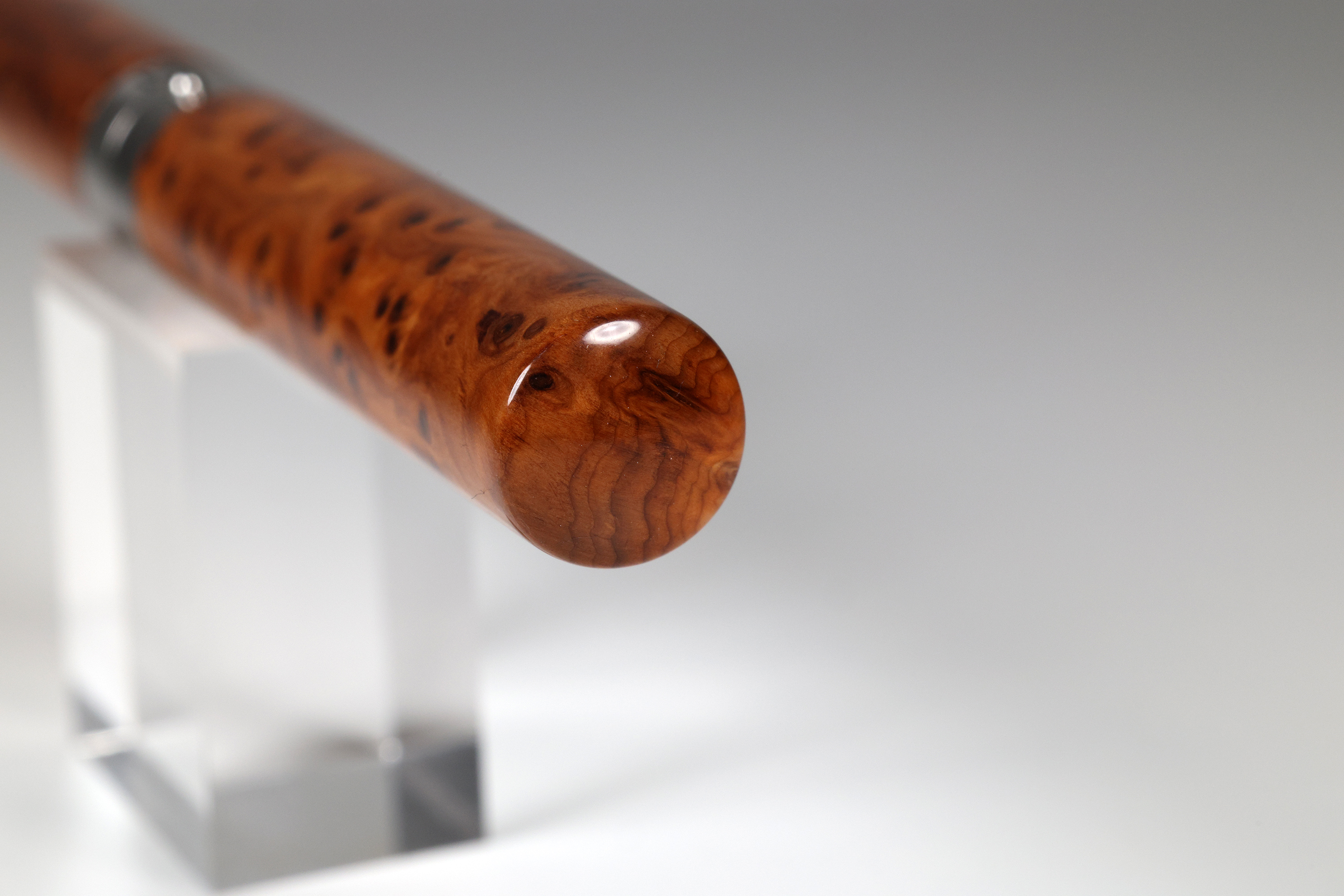 Ausgestattet ist der EXPLORER mit einem äusserst schlanken aber sehr effektivem Roll-Stop-Pin. Dieser sorgt dafür, das der EXPLORER genau da bleibt wo er hingehört. Auf Ihrem Schreibtisch. Auch im aufgeschraubten Zustand. Auf einen Clip wurde bewusst verzichtet. Gefertigt wurde der Füller als sogenannter Closed-End.